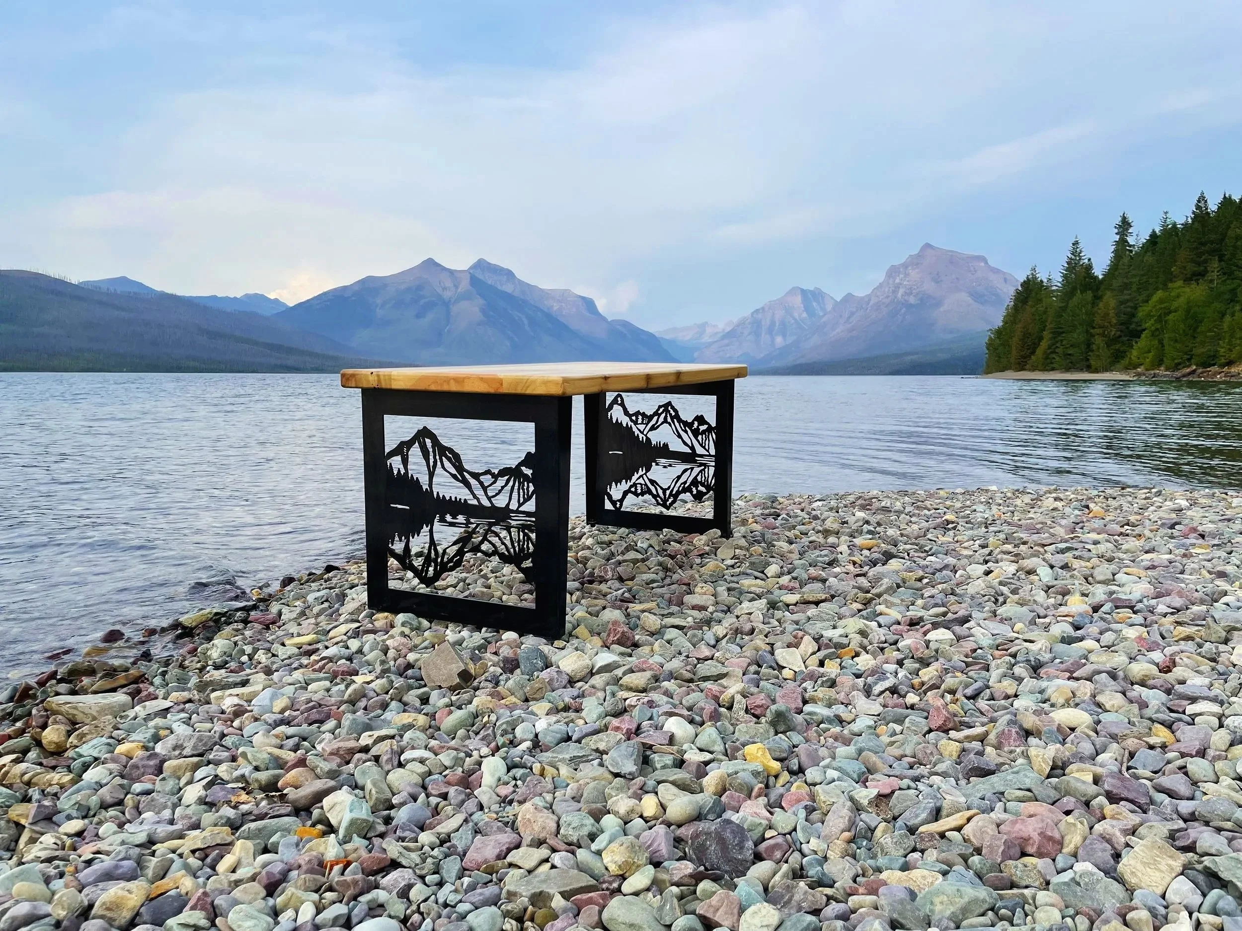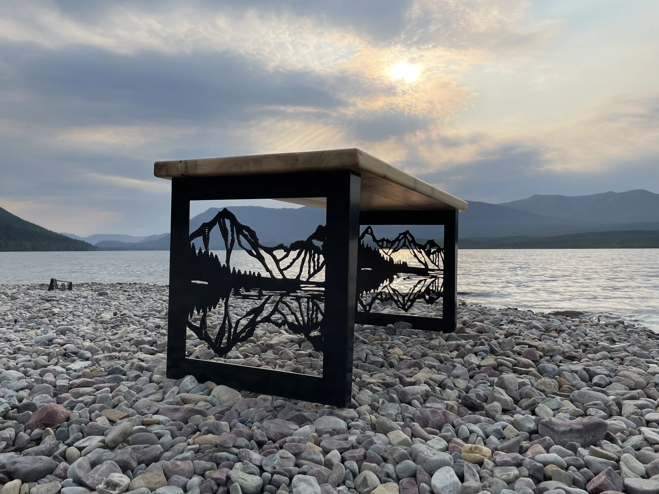Get lost in this custom Lake McDonald View metal and wood bench build, designed from one of our many photos taken in Glacier National Park.