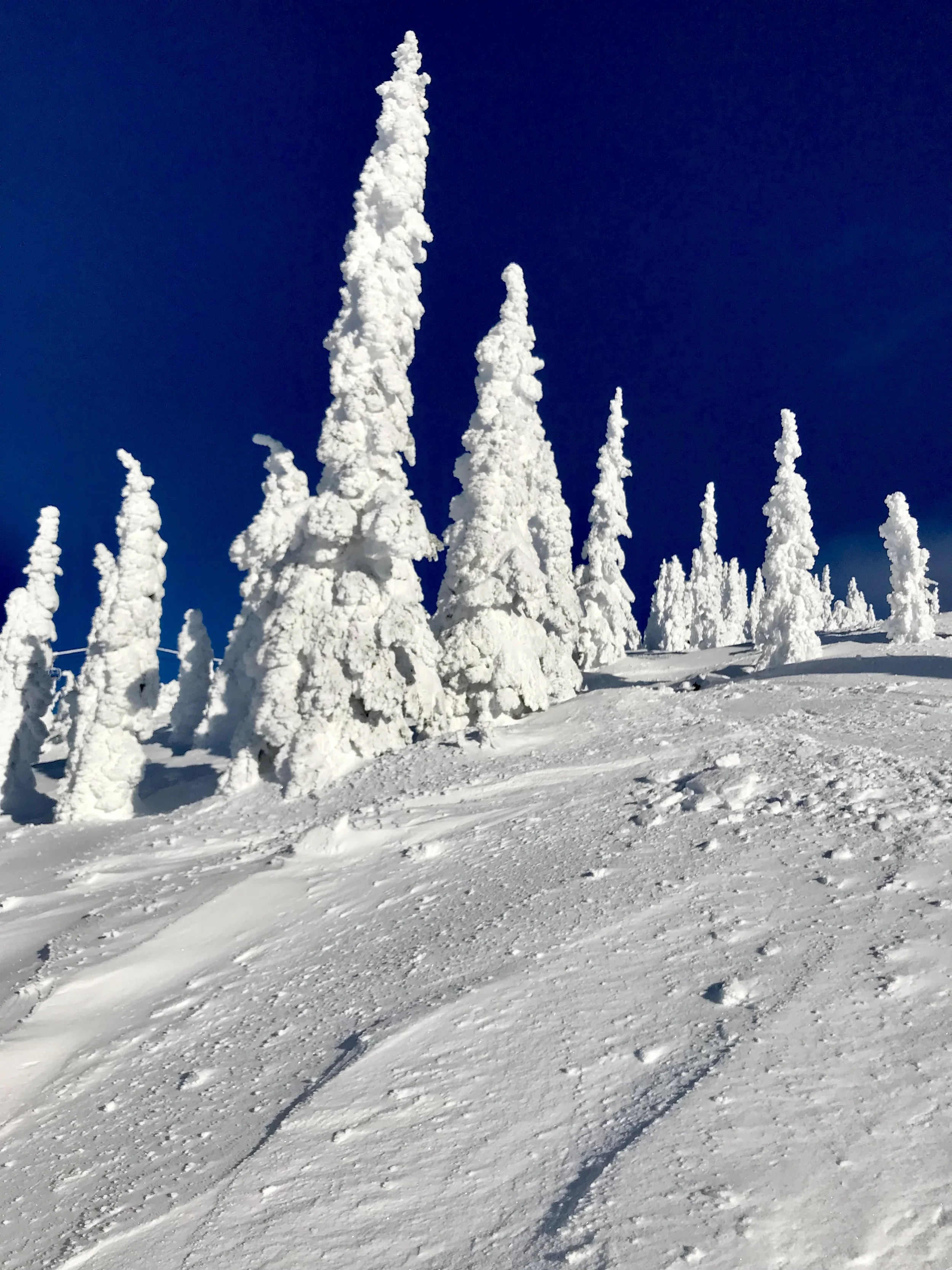 Glow Ghost Steel Wall Art - King Bed Head Board A double layer one-of-a-kind steel snow ghost wall art piece, with an antique patina on the back layer, copper patina on the front, designed and inspired by the magical snow ghosts on Big Mountain (snow caked trees at Whitefish Mountain Resort).